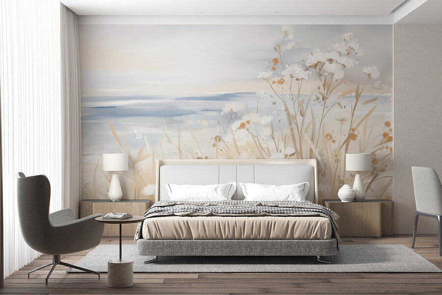 Premeňte svoj priestor pomocou tejto úžasnej nástennej maľby s jemnými kvetmi a mäkkými trávami. Predstavte si, že vstúpite do miestnosti, ktorá je ako jemný vánok počas teplého jarného dňa. Zemité tóny a akvarelová atmosféra vytvárajú upokojujúcu atmosféru, ktorá dokáže rozžiariť každý kút domu. Či už je to v útulnom čitateľskom kútiku alebo v živej obývačke, táto nástenná maľba pozýva do interiéru dotyk prírody. Priatelia by mohli povedať, že sa cítia ako na mini úteku do pokojnej záhrady. Tak smelo do toho, prijmite toto kvetinové čaro a nechajte tieto kvety vdýchnuť život do vášho priestoru!