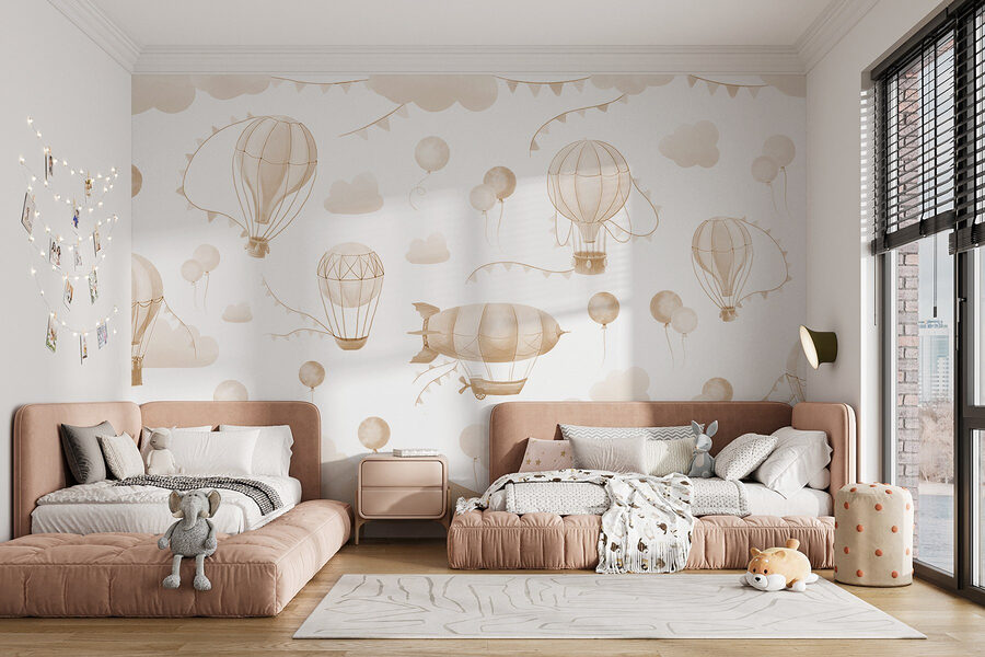 Premeňte akúkoľvek miestnosť pomocou tejto rozmarnej nástennej maľby so živou skupinou teplovzdušných balónov vznášajúcich sa nad miernymi horami. Je to ako preniesť kúsok dobrodružstva do interiéru, kde každý pohľad vyzerá ako pohľad do nekonečnej oblohy. Jemné odtiene nabádajú k uvoľnenej atmosfére, ktorá je ideálna pre útulné priestory, v ktorých ožívajú sny. Predstavte si, že popíjate čaj a sledujete, ako sa okolo vás vznášajú tieto očarujúce balóny a každý z nich podnecuje malú predstavivosť. Či už v detskej izbe alebo v kreatívnom kútiku, táto nástenná maľba dodáva nádherný nádych radosti a pripomína každému, aby vždy mieril vysoko a sníval vo veľkom.