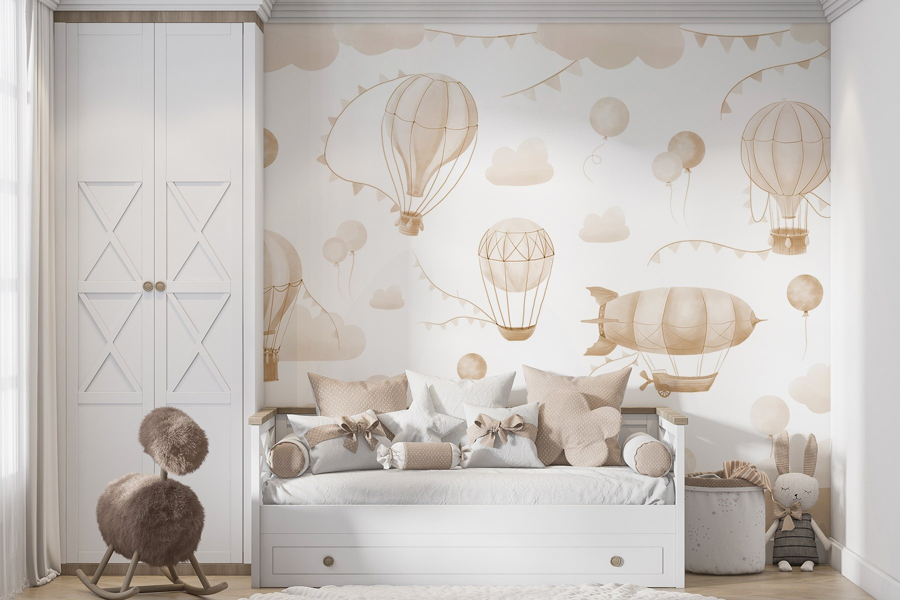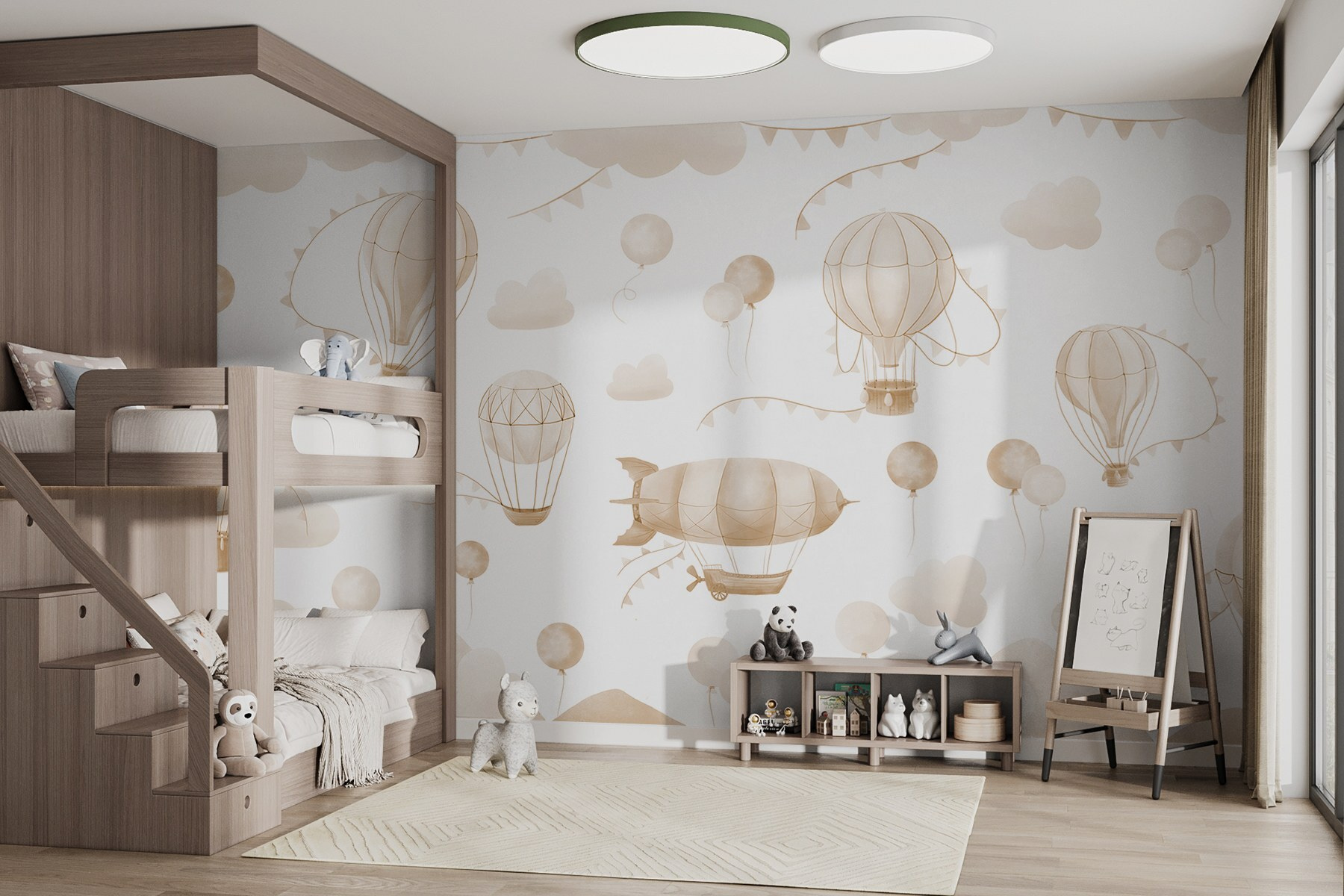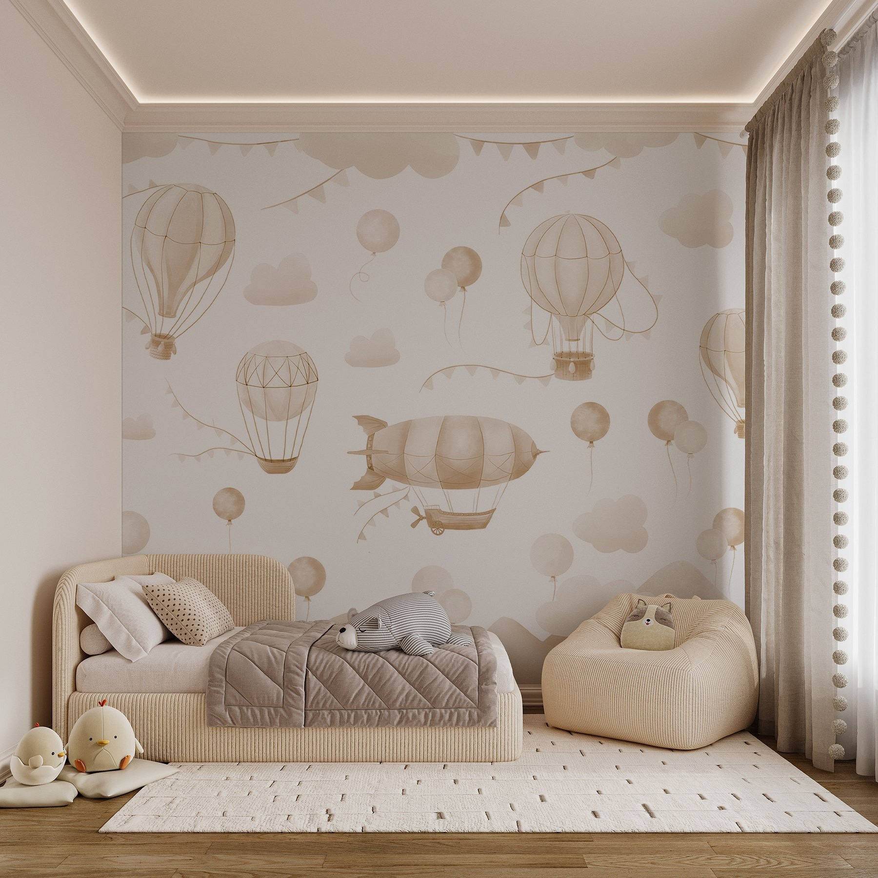 Premeňte akúkoľvek miestnosť pomocou tejto rozmarnej nástennej maľby so živou skupinou teplovzdušných balónov vznášajúcich sa nad miernymi horami. Je to ako preniesť kúsok dobrodružstva do interiéru, kde každý pohľad vyzerá ako pohľad do nekonečnej oblohy. Jemné odtiene nabádajú k uvoľnenej atmosfére, ktorá je ideálna pre útulné priestory, v ktorých ožívajú sny. Predstavte si, že popíjate čaj a sledujete, ako sa okolo vás vznášajú tieto očarujúce balóny a každý z nich podnecuje malú predstavivosť. Či už v detskej izbe alebo v kreatívnom kútiku, táto nástenná maľba dodáva nádherný nádych radosti a pripomína každému, aby vždy mieril vysoko a sníval vo veľkom.
