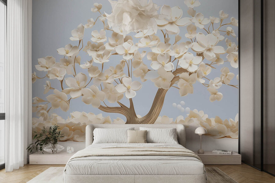 Premeňte svoj priestor s očarujúcou „nástennou maľbou Strom s bielymi kvetmi“. Predstavte si, že vstúpite do miestnosti a privíta vás pokojný, kvitnúci strom, ktorý šepká pokoj. Jemné, delikátne kvety vytvárajú pokojnú atmosféru, ideálnu na snenie alebo možno len na únik od každodenného chaosu. Je to ako mať kúsok japonskej záhrady priamo doma – kto by nechcel popíjať čaj pred touto krásou?