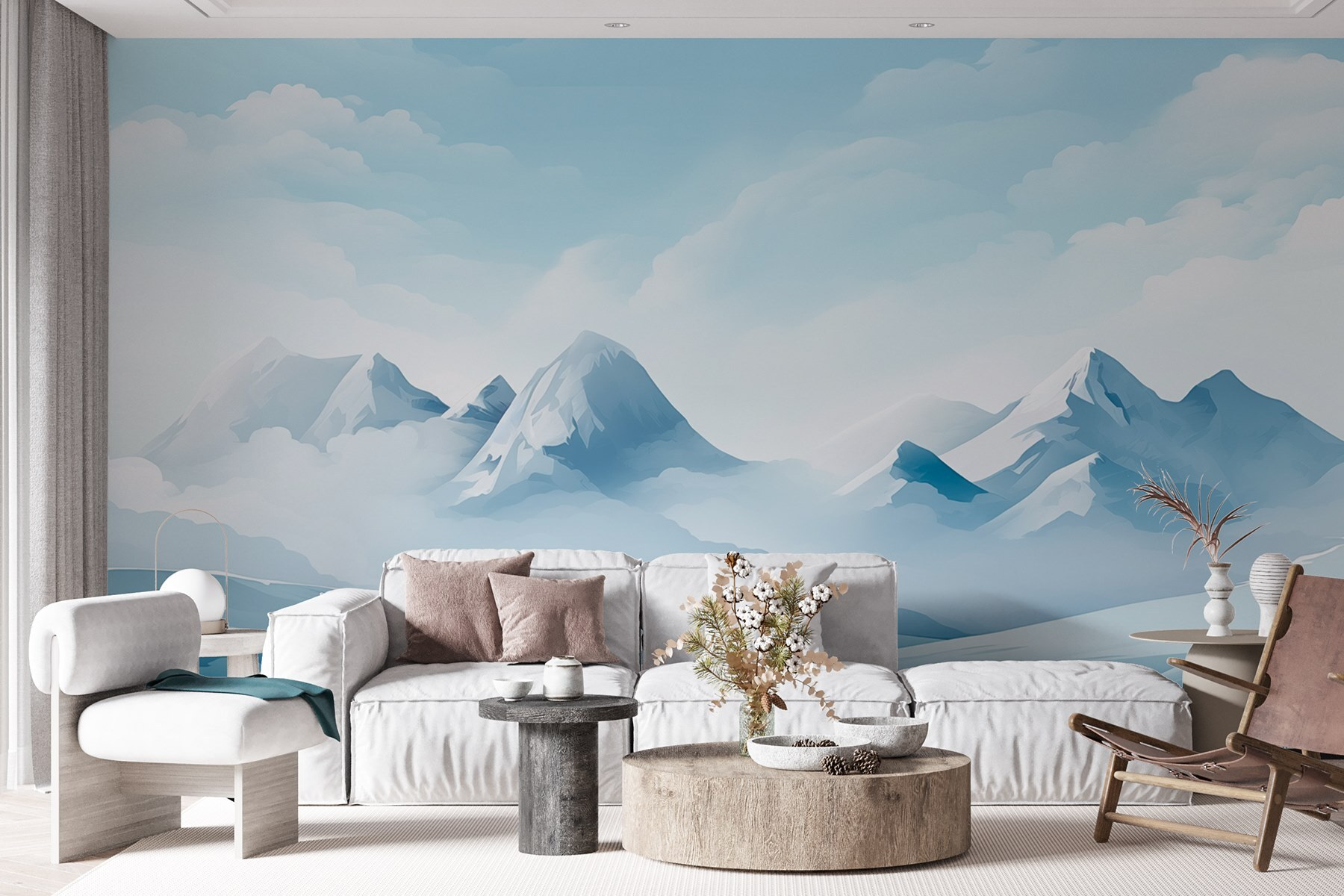 The soft blues and whites create a relaxing atmosphere, perfect for unwinding after a busy day. Friends might even wonder if you’ve installed a window to a winter wonderland. Whoever said you can’t bring the mountains home clearly didn’t have this mural in mind. Dive into serenity with this piece that captures nature’s tranquility in every glance.
