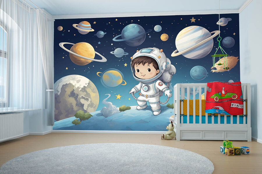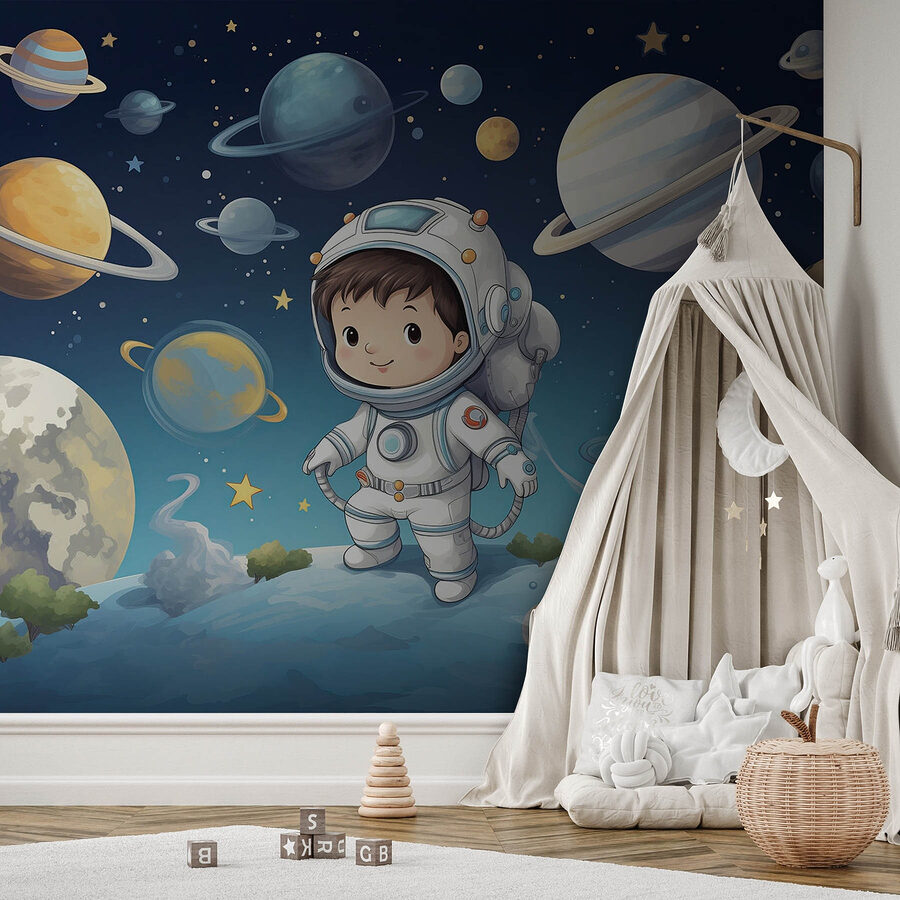 Vydajte sa na dobrodružstvo s touto nádhernou nástennou maľbou, na ktorej je zobrazený rozkošný chlapec v skafandri! Predstavte si to: izba premenená na kozmické ihrisko, kde fantázia môže lietať vyššie ako Saturnove prstence. Živé farby zachytávajú očarujúcu krásu galaxie. Najmenší môžu snívať vo veľkom, vznášať sa medzi planétami a hviezdami, ktoré vzbudzujú zvedavosť a radosť! Či už je to detská izba alebo herňa, táto tapeta dodáva miestnosti fantáziu a kúsok kozmickej mágie. Kto by nechcel naháňať meteory a zároveň si pochutnávať na občerstvení? Je to ako mať pripraveného mini astronauta na medziplanetárnu zábavu priamo na stene!
