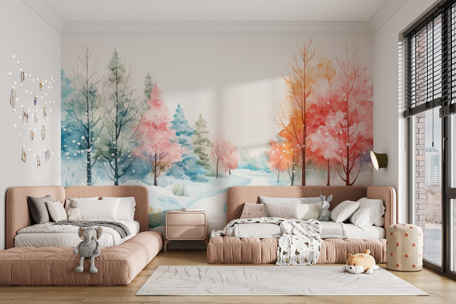 Premeňte akýkoľvek priestor pomocou tejto zasnenej nástennej maľby s akvarelovým výjavom zasneženej cesty v objatí stromov. Predstavte si jemné chrumkanie snehu pod nohami a jemné šumenie konárov, ktoré sa kývajú vo vetre. Prináša nádych pokoja a rozmarnosti, ideálny na zútulnenie obývačky alebo rozjasnenie pracovne. Hravé farebné odtiene stromov vnesú teplo aj do tých najmrazivejších rán. Je to ako vstúpiť do zimnej krajiny zázrakov, bez studených prstov a odhadzovania snehu. Tak prečo nenechať svoje steny rozprávať príbeh pokoja a krásy?