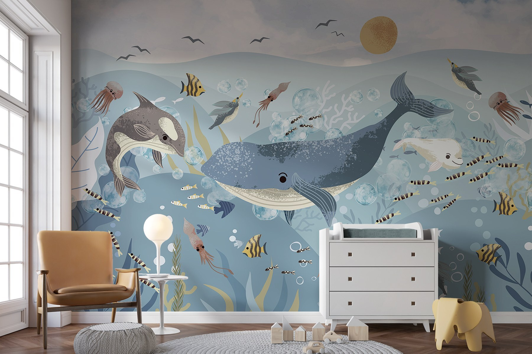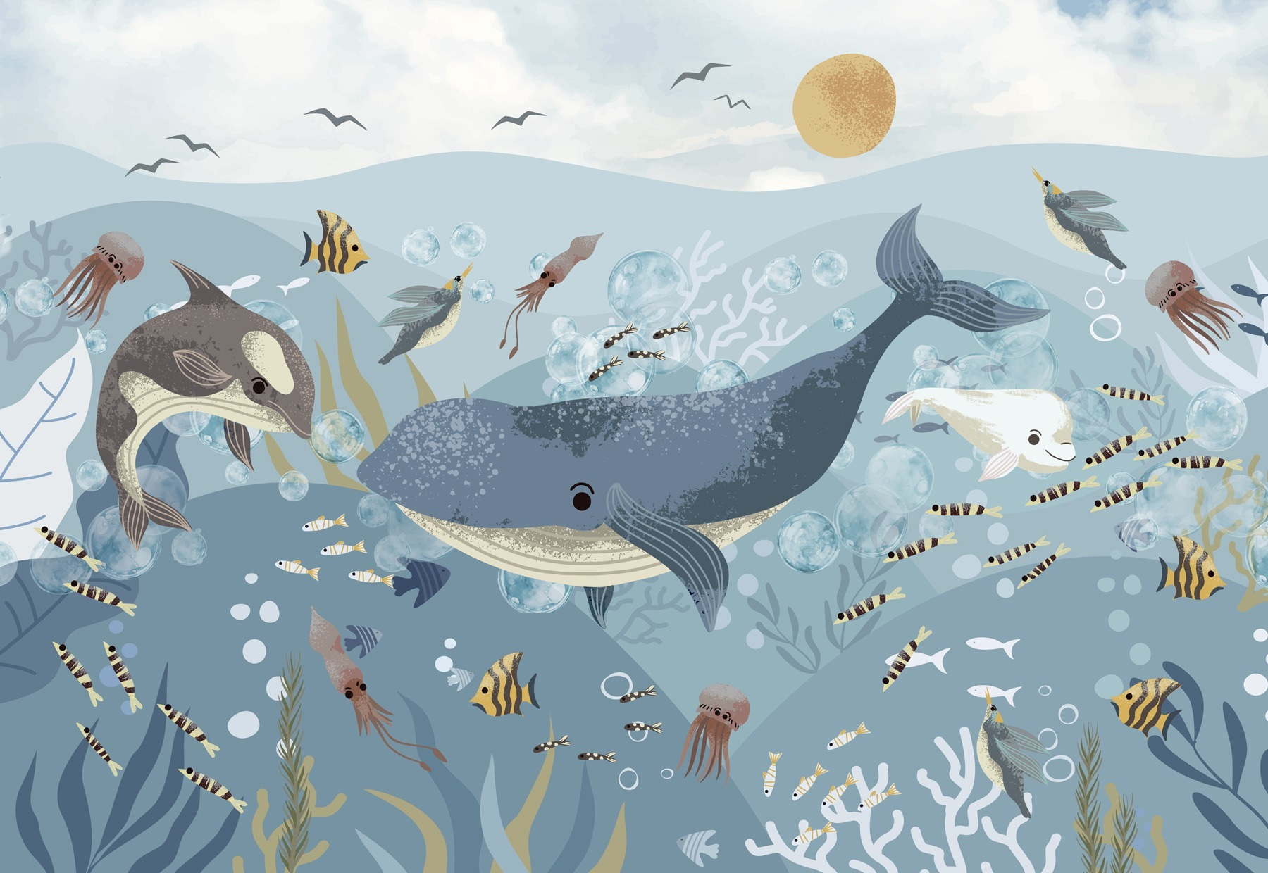 Ponorte sa do sveta rozmarov s touto nástennou maľbou, na ktorej je živá zmes rýb a veľrýb, ktoré sa preháňajú pod jemnými vlnami oceánu. Predstavte si deti, ako sa chichocú, pozorujú farebné medúzy a rozkošné delfíny, ktoré plávajú okolo. Je to ako kŕmiť svoju fantáziu raňajkami s prídavkom dobrodružstva! Priatelia sa budú unášať do miestnosti a okamžite pocítia chladivý oceánsky vánok (alebo si ho aspoň predstavia). Táto fototapeta, ktorá je ideálna do detskej izby alebo útulného čitateľského kútika, premení každú stenu na spleť šťastia. Tak smelo do toho, nechajte túto podmorskú párty rozžiariť tieto nudné priestory!