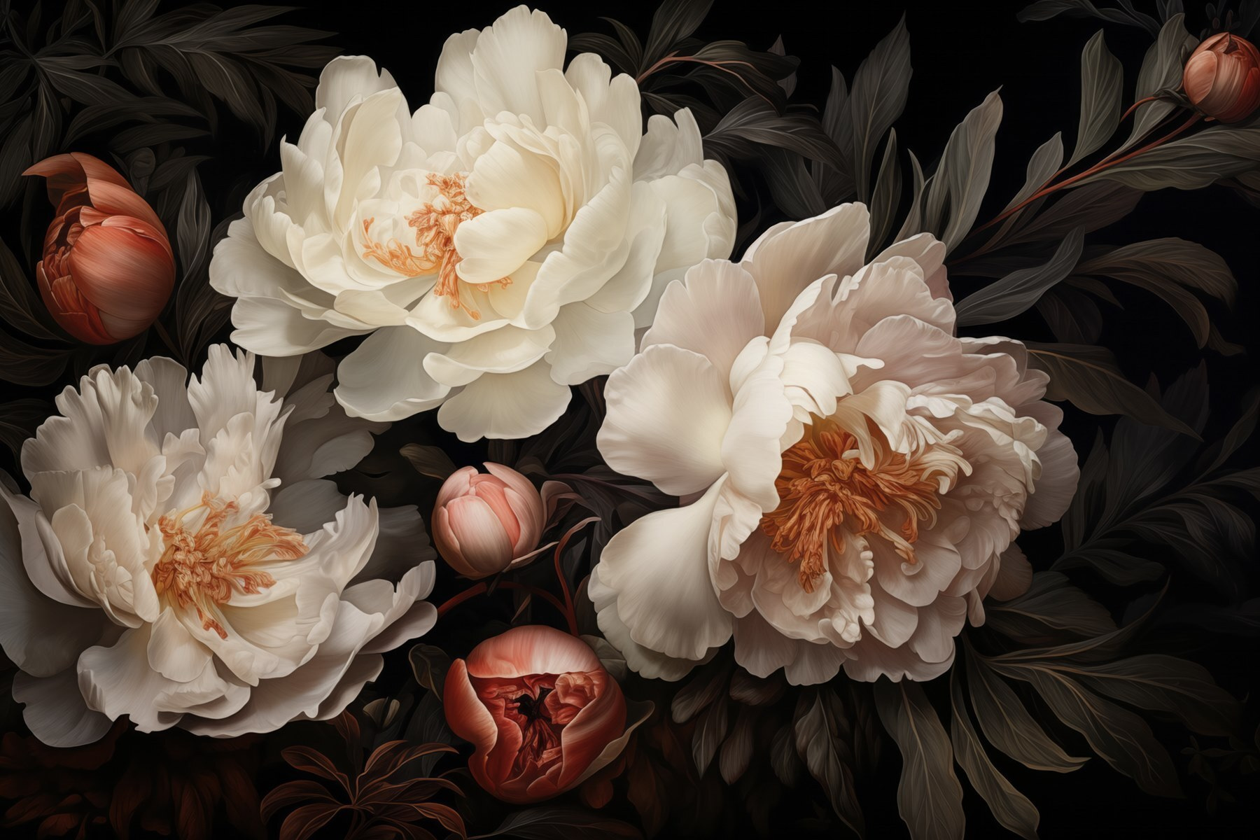 Predstavte si, že vstúpite do miestnosti, ktorá pripomína tajnú záhradu, kde krása pivónií všetko oživuje. Táto fototapeta s úžasnou skupinou bielych kvetov premení každý priestor na pokojné útočisko. Predstavte si, ako popíjate rannú kávu obklopení jemnými okvetnými lístkami šepkajúcimi pokoj. Bohaté kontrasty kvetov oproti tmavým listom vytvárajú útulné objatie, ideálne na lenivé popoludnia. Hovorte o tom, ako sa dá začať konverzácia! Je to ako mať kúsok prírody v interiéri, bez zalievania. Pridajte šmrnc a nechajte každý pohľad rozkvitnúť do radosti.