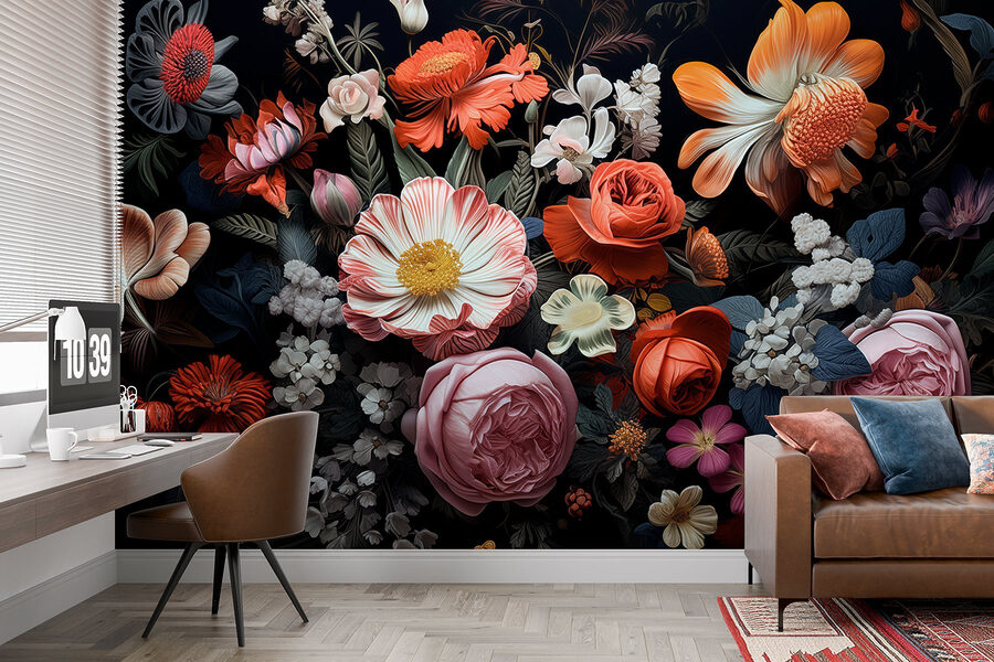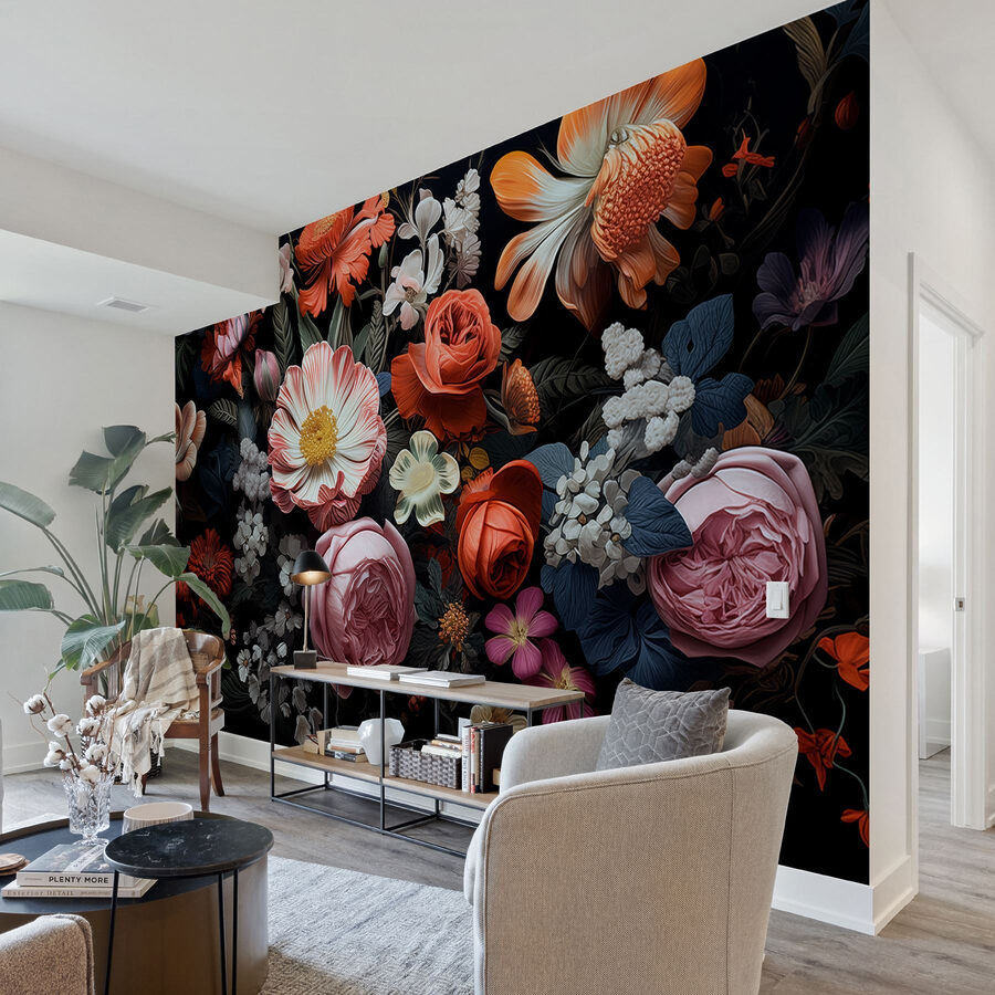 Premeňte svoj priestor pomocou tejto úžasnej nástennej maľby so živou skupinou kvetov na výraznom čiernom pozadí. Predstavte si, že vstúpite do miestnosti, kde zo stien zdanlivo vyžaruje krása prírody. Každý kvet má svoj vlastný príbeh, žiarivé okvetné lístky šepkajú tajomstvá záhrady v plnom rozkvete. Táto nástenná maľba pozýva teplo a život do akéhokoľvek priestoru – ideálna do útulnej obývačky alebo elegantnej kancelárie. Hostia sa možno pri pohľade na ňu budú pýtať, kde je záhrada. Čo je lepšie ako trochu kvetinovej inšpirácie, ktorá vyvolá radosť?
