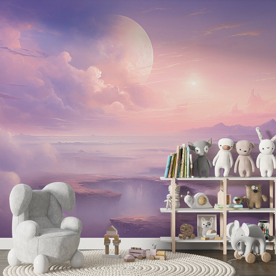 Premeňte svoj priestor pomocou tejto zasnenej nástennej maľby s úžasnou krajinou, kde nadýchané oblaky objímajú žiariaci mesiac. Je to ako preniesť pokojnú krásu súmraku priamo do vášho domova. Predstavte si, ako ležíte na pohovke, popíjate čaj a nechávate sa unášať upokojujúcimi farbami – jemnou fialovou, teplou ružovou a múdrymi obláčikmi, ktoré priam nabádajú na snívanie.