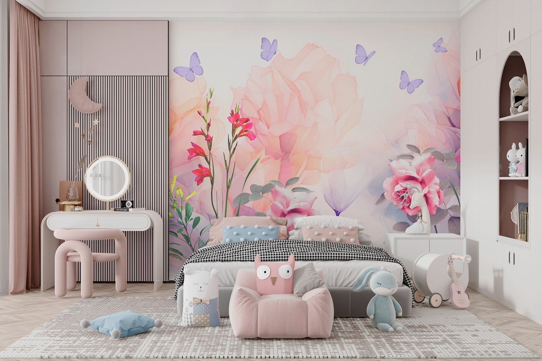 Premeňte nudnú stenu na rozkvitnutý raj s touto očarujúcou fototapetou s kvetmi a motýľmi. Predstavte si leňošenie počas slnečného popoludnia, šálku čaju vedľa seba, zatiaľ čo živé kvety a poletujúci priatelia vnesú do vášho priestoru ľahkú náladu. Akvarelový dizajn šepká jar – jemné okvetné lístky sa kolíšu vo vetre, zatiaľ čo motýle tancujú okolo, takže každý pohľad je mini únikom do prírody. Ideálny do útulného kúta alebo živej obývačky, je ako pozvať záhradu do interiéru, bez zalievania. Kto potrebuje zelený palec, keď má túto krásu?