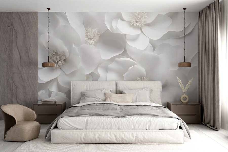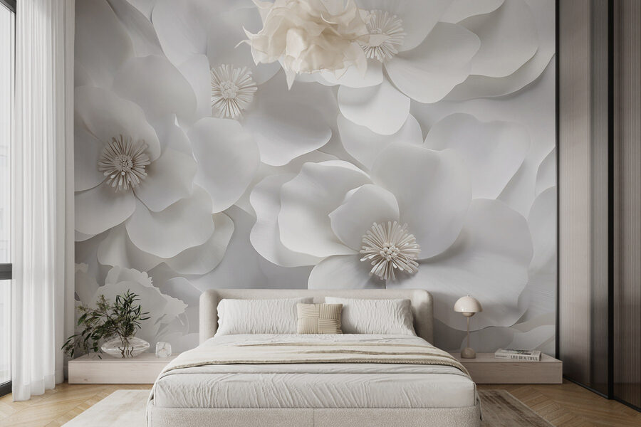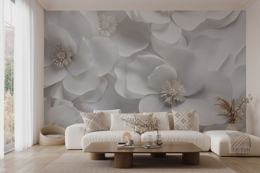 Premeňte nudný priestor na pokojné útočisko pomocou nástennej maľby “Skupina bielych kvetov”. Predstavte si, že vstúpite do miestnosti, v ktorej žiarivo kvitnú nadrozmerné kvety a vnášajú do interiéru nádych prírody. Jemná, decentná paleta podporuje atmosféru pokoja, ktorá je ideálna na útulné večery alebo živé brunche s priateľmi. Je to ako pohľad do záhrady za úsvitu – jemný, svieži a osviežujúci. Navyše, kto by nechcel byť obklopený kvetmi po celý rok? Perfektne sa hodí do spálne, obývačky alebo aj do elegantnej kancelárie. Rozlúčte sa s hladkými stenami a privítajte kvetinové objatie!