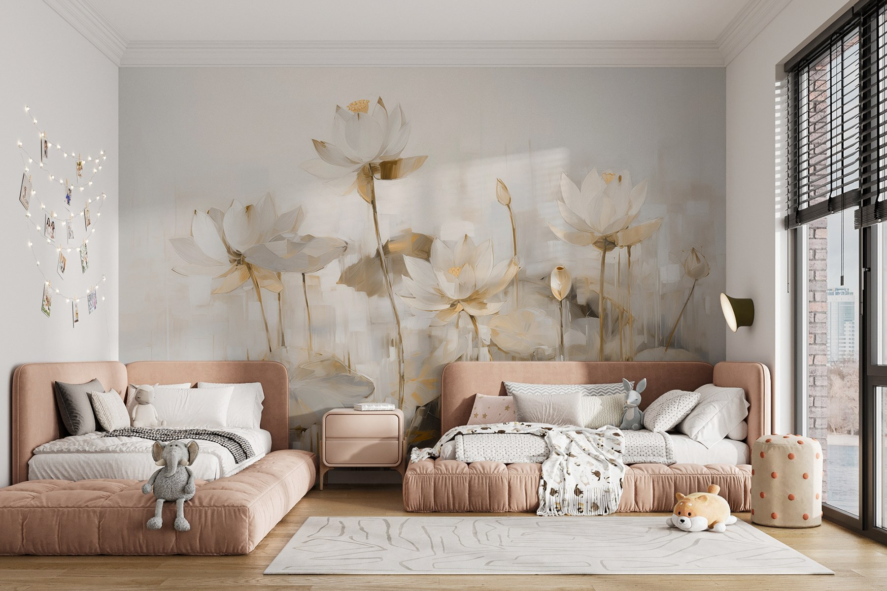 Predstavte si, že vojdete do miestnosti a privíta vás pokojná elegancia bielych kvetov v plnom rozkvete. Táto fototapeta zachytáva tento pokojný pocit a premení každý priestor na pokojné útočisko. Jemné odtiene a jemné ťahy štetcom pripomínajú pokojnú záhradu počas slnečného popoludnia. Je to ako vniesť do interiéru prírodu, ale bez otravného peľu. Táto nástenná maľba, ktorá je ideálna na vytvorenie útulného čitateľského kútika alebo dodanie šarmu spálni, šepká relaxáciu. Zakomponujte ju do svojho interiéru a sledujte, ako pozdvihne celú atmosféru. Je to viac než len dekorácia; je to závan čerstvého vzduchu.
