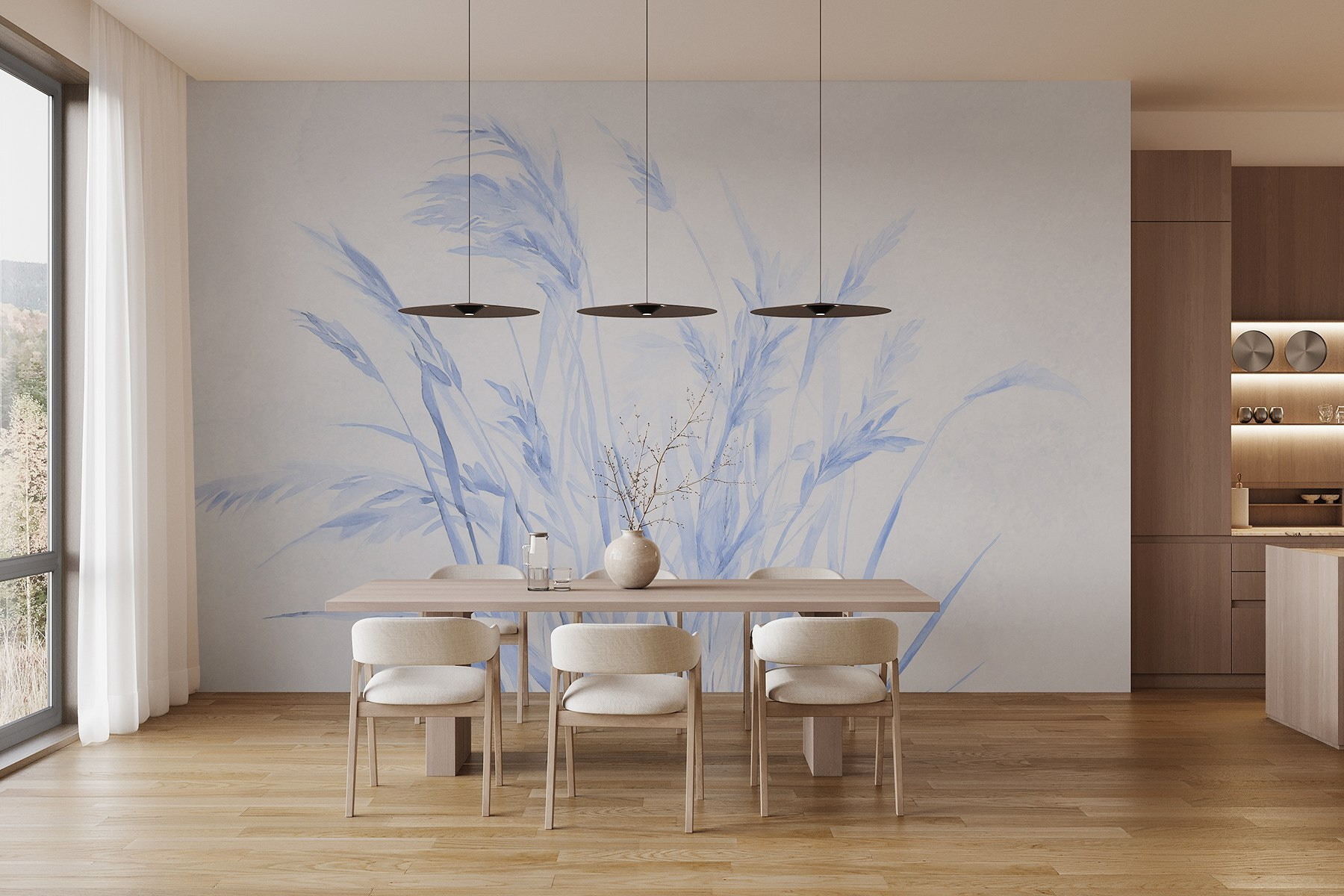 Predstavte si, že vstúpite do pokojného sveta, kde jemný vánok šepká cez mäkké steblá trávy – táto nástenná maľba prináša tento snový výjav priamo na vašu stenu. Chladné modré odtiene vytvárajú pokojnú atmosféru, vďaka ktorej sa každý priestor bude cítiť pokojnejšie. Predstavte si, ako si po dlhom dni oddýchnete a ponoríte sa do upokojujúcich vizuálnych efektov, akoby ste leňošili na trávnatej lúke, len vy a vaša obľúbená kniha. Je ideálny do obývacích izieb alebo útulných čitateľských kútikov. Táto nástenná maľba nielenže oblečie steny, ale vdýchne vášmu domovu život a pozve vás do tepla a k odpočinku.